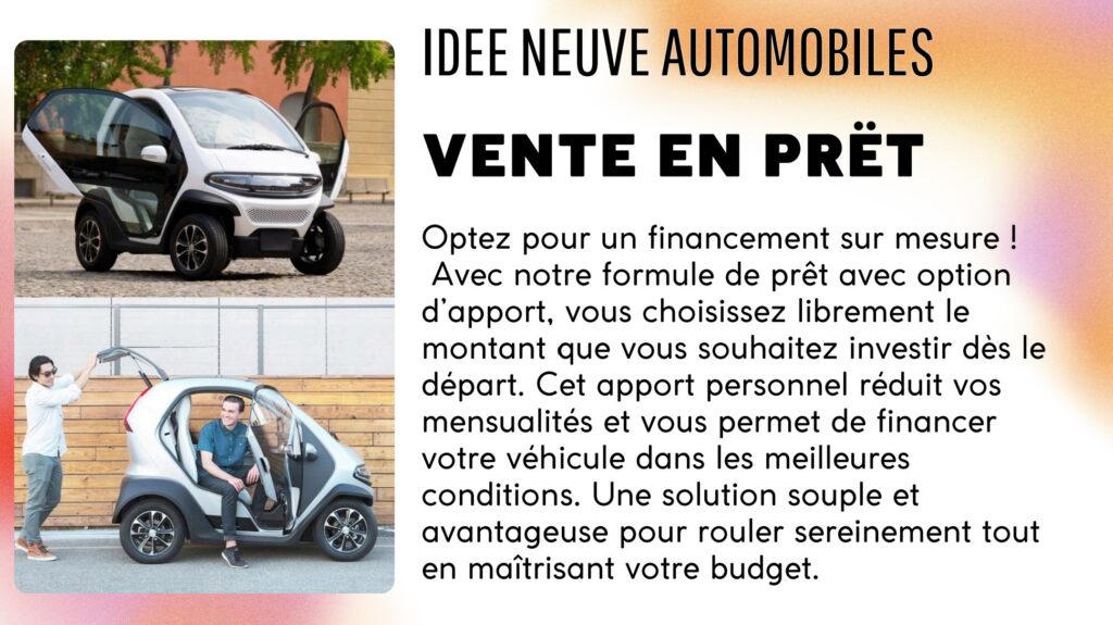 Chez IDÉE NEUVE AUTOMOBILES, nous vous invitons à découvrir une nouvelle façon d’envisager le financement : simple, souple et adaptée à vos besoins.