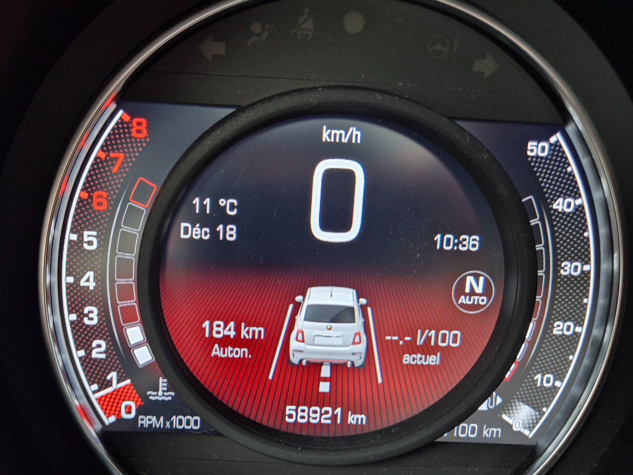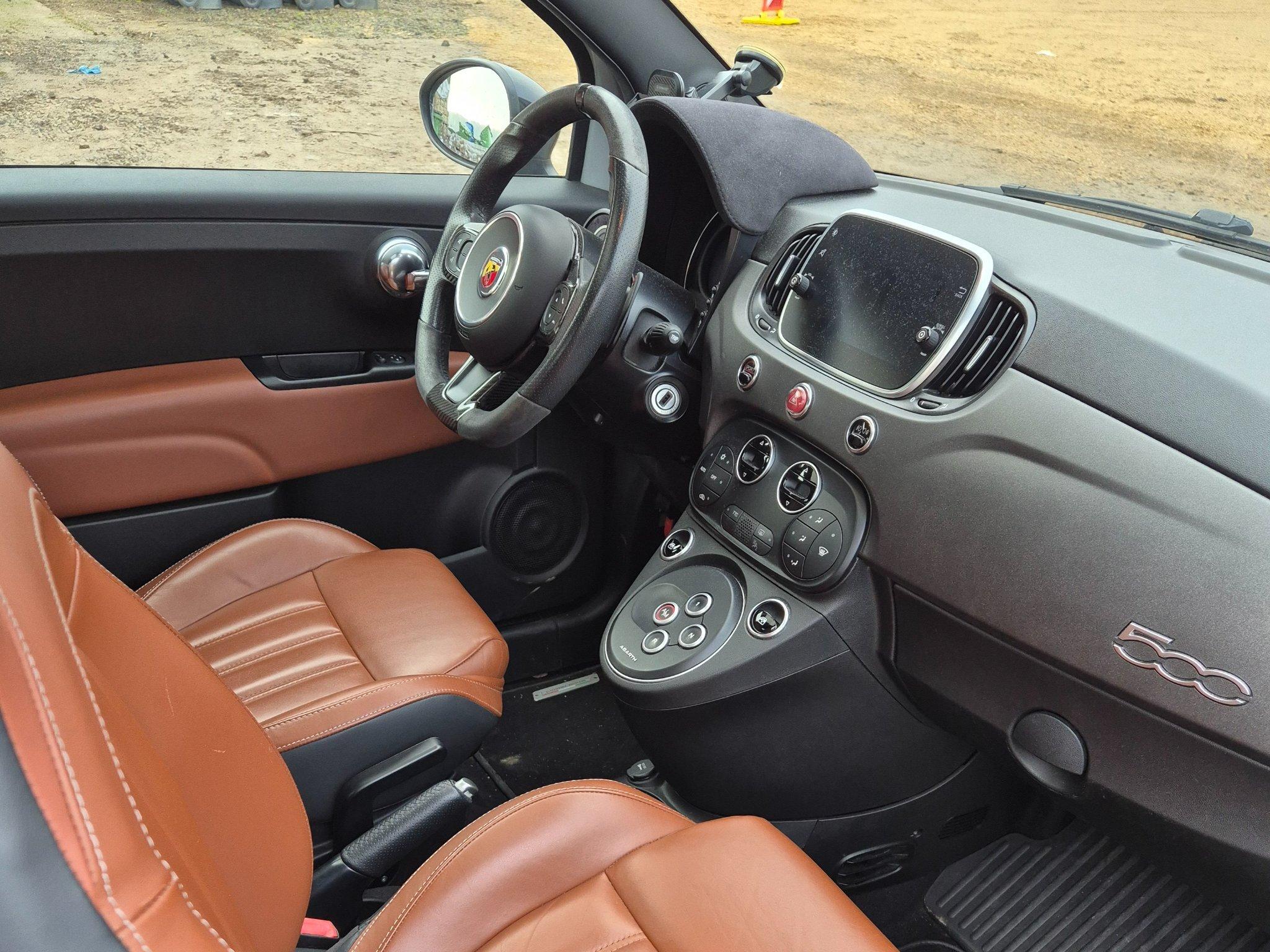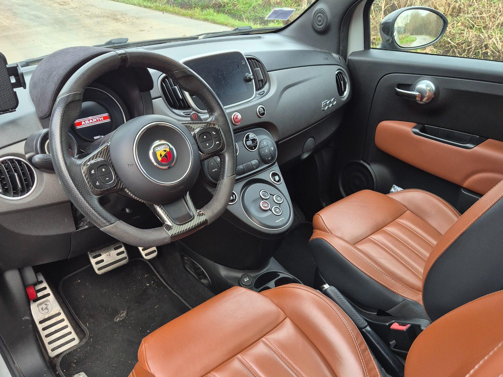 À l’intérieur, le 595 propose un habitacle compact mais parfaitement optimisé pour la conduite sportive. Tout d’abord, le poste de conduite intègre un volant sport, des sièges baquets et des commandes intuitives, offrant une prise en main immédiate. Ensuite, les matériaux de qualité et les finitions soignées assurent confort et style. L’écran central permet de gérer facilement la navigation, le multimédia et la connectivité smartphone, tout en restant orienté vers le conducteur pour une réactivité maximale.