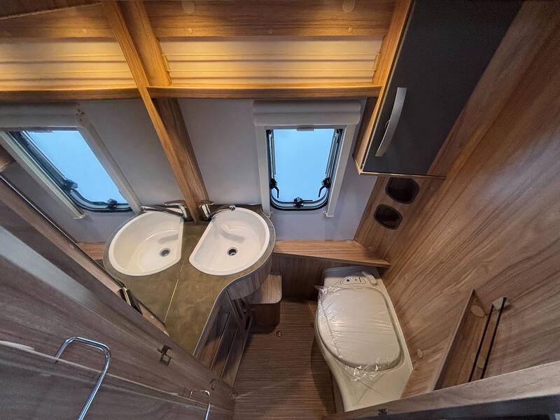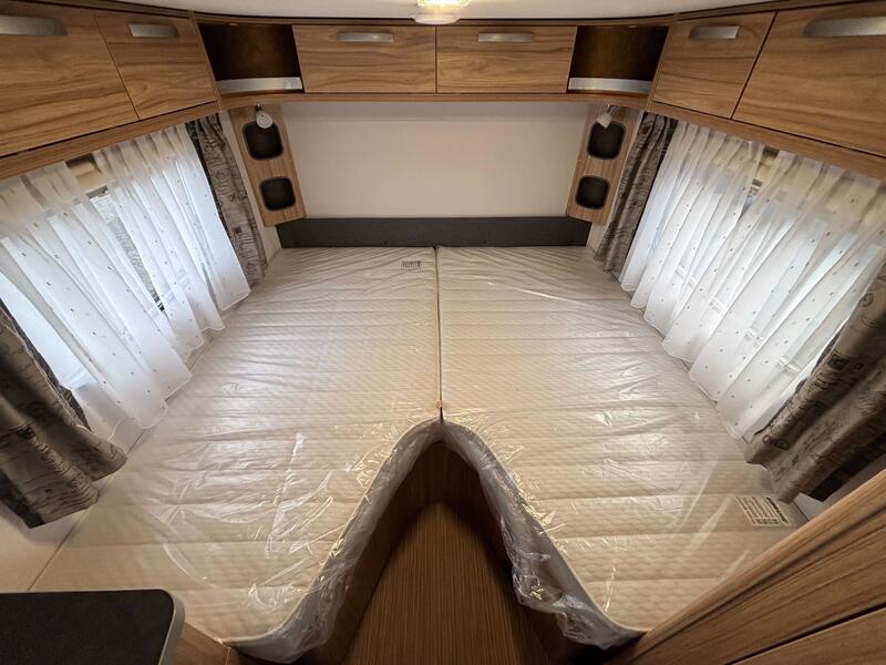Options modèle exposéAugmentation PTAC à 1.400 kg + Roue de secours sur jante alliage + Moustiquaire sur toute la hauteur de la porte à usage facile grâce au guidage latéral + Poubelle intégrée à la porte cellule + Trappe extérieure arrière côté gauche, 75 x 30 cm + Coussin supplémentaire entre lits jumeaux + Coussins confort pour dînette avant + Coussins avec housse + Couvercle évier avec planche à découper + Prise store universelle (230 V, 12 V, TV) avec précâblage TV à l’intérieur + Prise de gaz extérieure avec robinet d’arrêt + Réservoir eaux usées 22 l, sur roulettes : 2655 €
