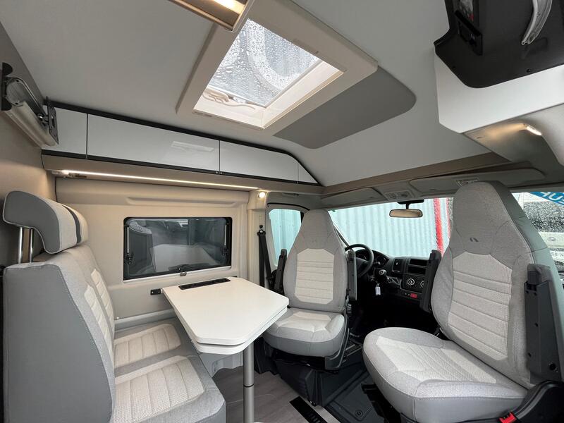Les sièges pilotes avant pivotants contribuent à agrandir visuellement et fonctionnellement la zone jour, créant un salon spacieux lorsqu’on est à l’arrêt. Adriakaravany.cz