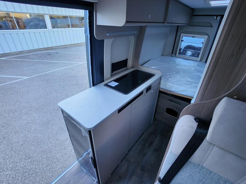 La cuisine du Carado CV 600 se montre compacte mais parfaitement équipée. Elle comprend une plaque de cuisson, un réfrigérateur performant et plusieurs rangements astucieux pour les ustensiles et les provisions.