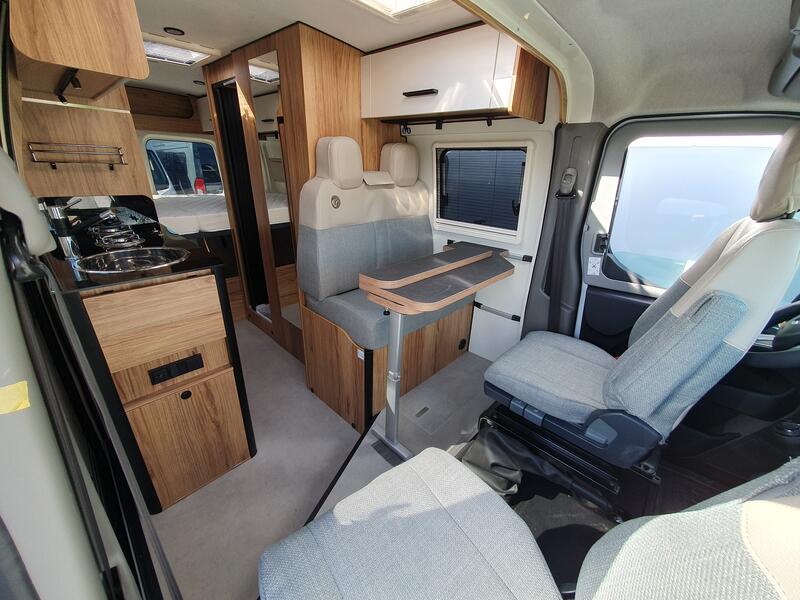 Les sièges avant pivotants agrandissent visuellement l’espace et transforment le coin jour en véritable salon convivial. Les nombreux rangements permettent de maintenir l’intérieur organisé, même lors de longs séjours.