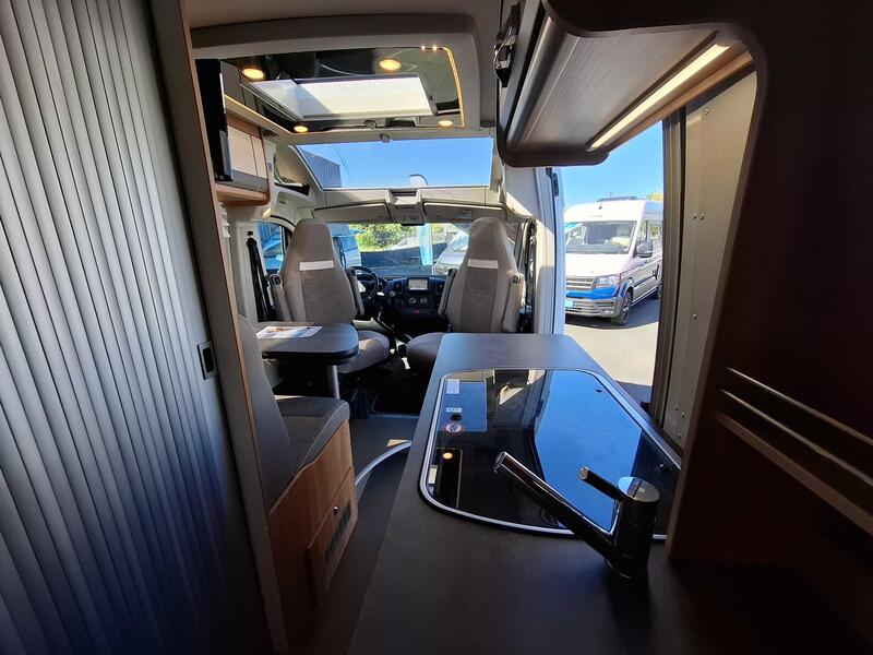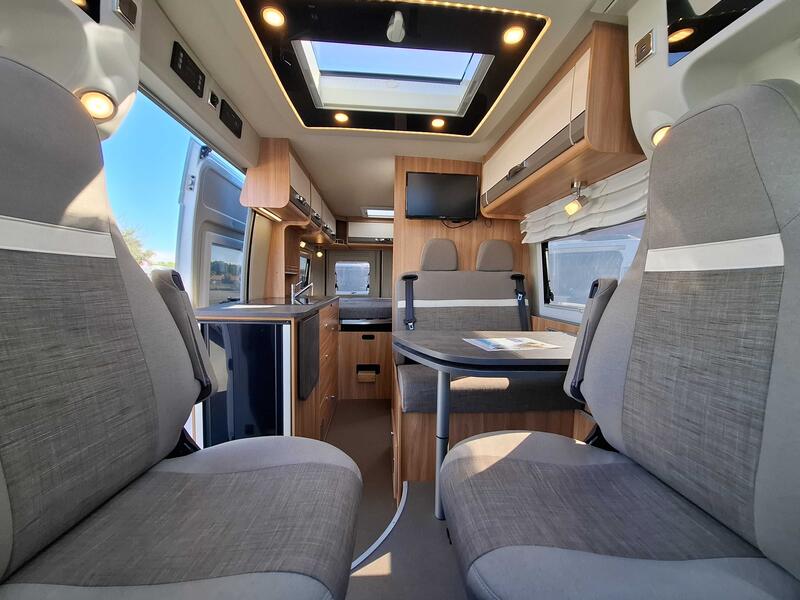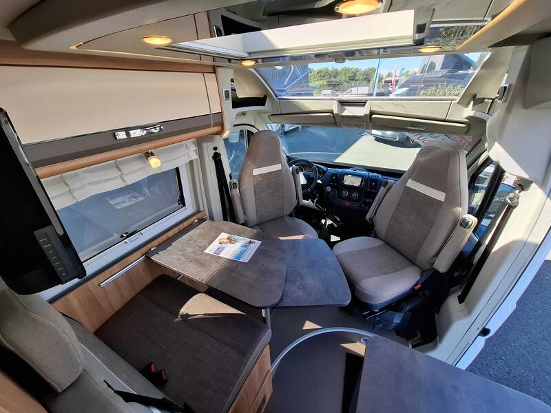 L’intérieur du Pössl Summit 600 Plus est agencé pour offrir un espace de vie convivial et modulable. Le coin salon comprend une banquette confortable et une table centrale. Les sièges avant pivotants agrandissent visuellement l’espace et créent un véritable coin détente.