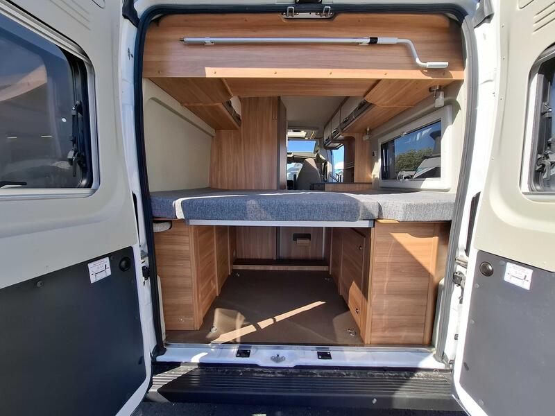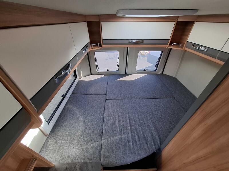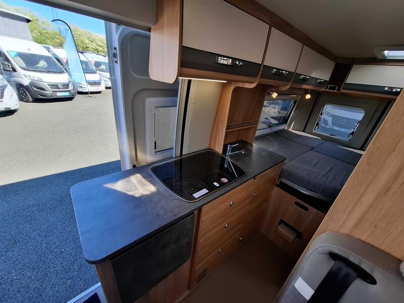 Ce modèle propose un couchage flexible, souvent sous forme de lit convertible à partir de la banquette du salon. Ce système optimise l’espace intérieur tout en offrant un confort satisfaisant pour deux adultes.