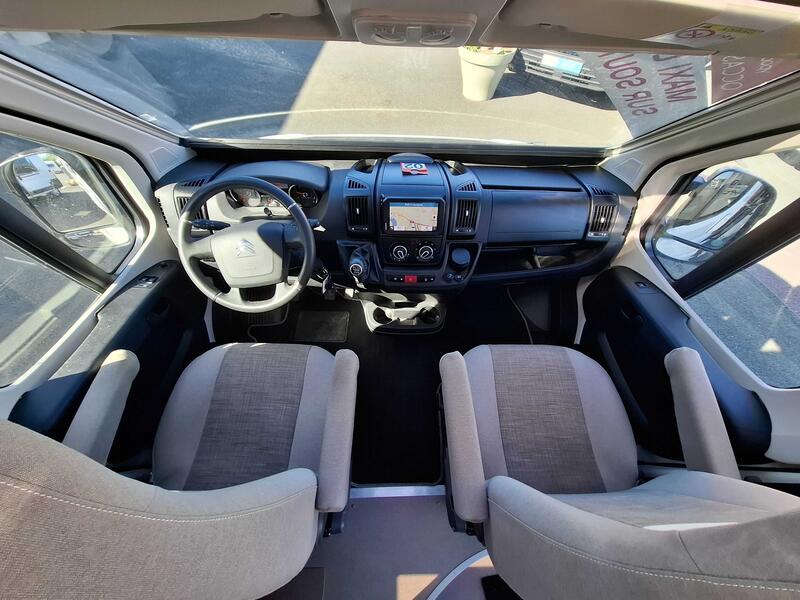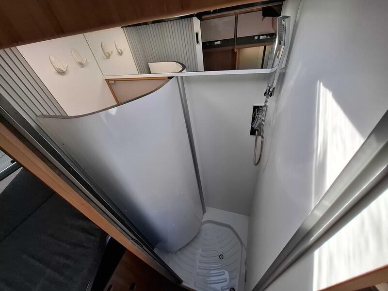 Selon la configuration du modèle d’occasion, la salle d’eau peut inclure une douche, un WC à cassette et un lavabo pratique. Malgré un espace compact, l’agencement reste fonctionnel et bien optimisé.
