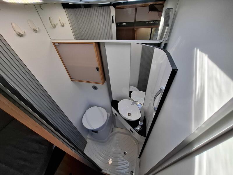 Les rangements intégrés facilitent le stockage des produits de toilette. Ainsi, l’hygiène quotidienne reste simple, même lors de séjours hors réseau.