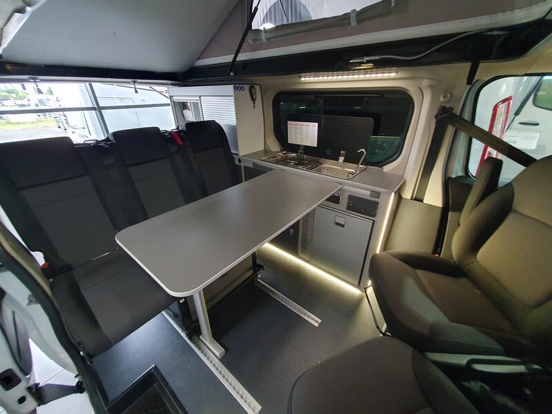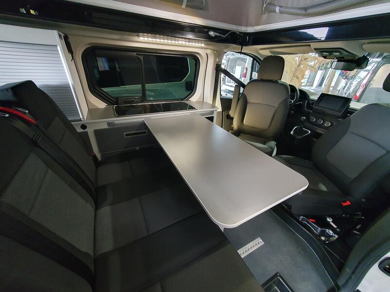 Le salon constitue le cœur de l’AUTOCAMP. Les assises confortables invitent à la détente après une journée de route. La table permet de prendre les repas ou de travailler dans un espace agréable. Les sièges cabine pivotants agrandissent l’espace et favorisent la convivialité. Les larges fenêtres apportent une luminosité naturelle, renforçant l’atmosphère chaleureuse. Ainsi, le salon se transforme rapidement en un lieu de vie modulable, adapté aux besoins de tous les occupants.