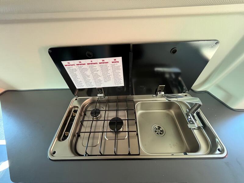 La cuisine intégrée est compacte mais complète, équipée d’une plaque de cuisson, d’un réfrigérateur performant et de rangements astucieux. Préparer les repas reste simple et agréable, même lors de séjours prolongés. Les placards et tiroirs permettent de ranger efficacement tous les ustensiles et provisions.